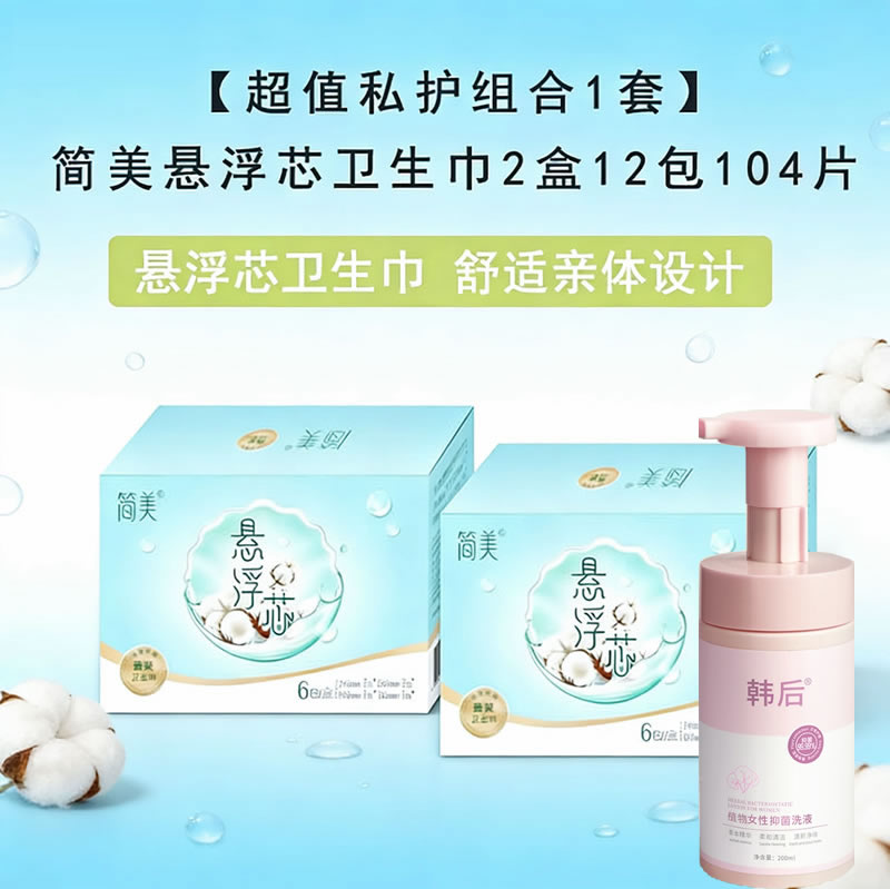 【卫生巾套装】简美悬浮芯卫生巾2盒12包104片(赠送植物抑菌洗液1瓶)|护垫、日用、夜用、超长组合套装|消字号姨妈卫生巾